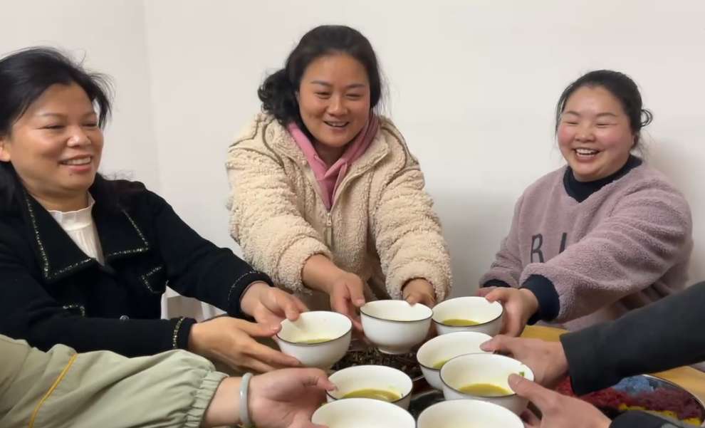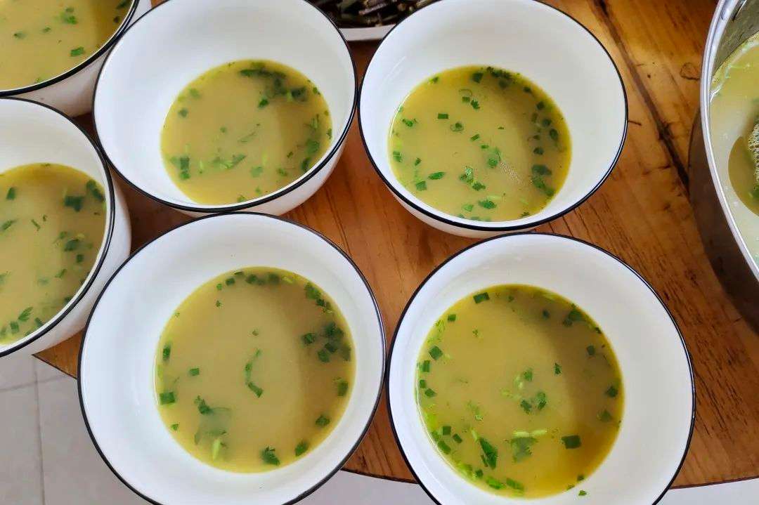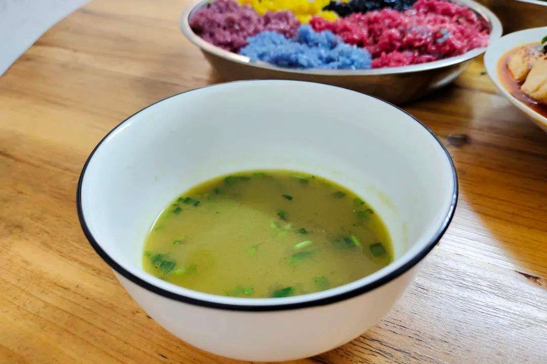 油茶味儿如何,全靠师傅炉火纯青、出神入化的手艺。擂油茶的力道要拿捏好,不能太用力也不能太轻,重了茶叶味太浓,口感不佳,轻了茶味出不来会有水气味,火候掌握则全靠长期自己体验出来的经验。待茶叶炒到有锅巴香味了,放入开水。等待水烧开的过程中,大家把油茶碗一字排开。水开之后让油茶水在锅内沸腾几分钟,然后放盐,根据各人喜好,再撒点香菜、葱花,便可品油茶了。