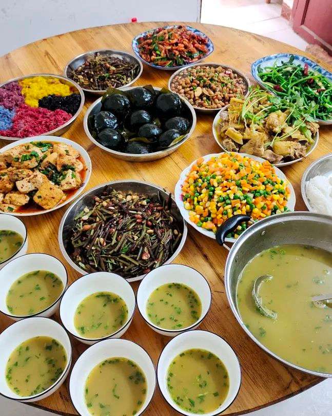 打油茶的工序可以很简单很随意,一盘老葱头,半碗花生米,几只老姜,三五人就可以摆开架子擂起来…也可以很复杂很丰盛,鸡鸭鱼肉摆满桌子,呼朋唤友十数人,以酒伴茶,也很正常,最主要的还是根据当下的心情和个人的口味爱好。“去我家喝油茶!”成了矿区人最好的邀请。